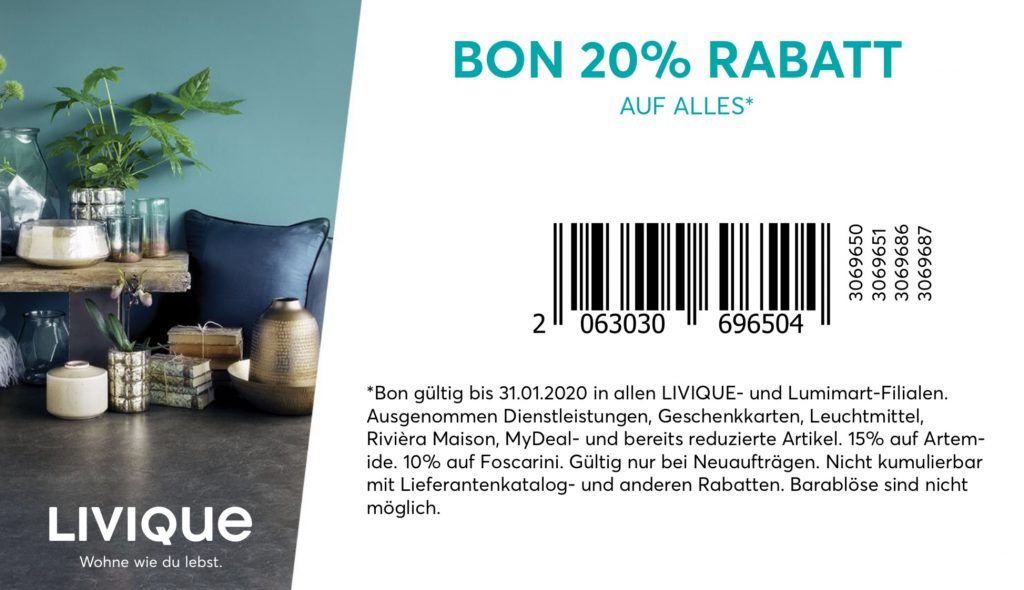 EDIT! Mit dem Code LQGB3519-1RX kann auf dem Online Shop neben den 30% auf Wohnaccessoires auf einen Einkauf von CHF50.- nochmals CHF 20.- sparen und erst noch kostenloser Versand! Bis am 07.10.2019 ist dieser zusätzliche Gutschein gültig! Daher fast 55%!!!