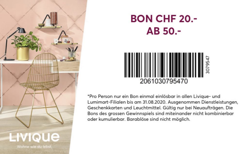 Ab einem Einkauf von CHF 50.- erhalter Ihr CHF 20.- Rabatt. Dieser Gutschein ist Online sowie im Store gültig.