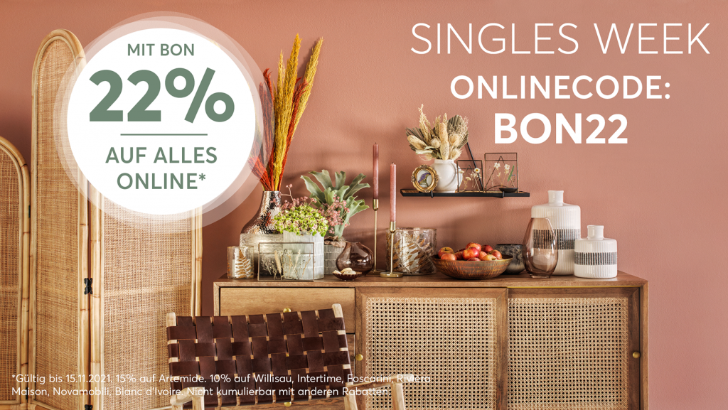 Mit dem Webcode BON22 profitieren Sie jetzt von 22% Rabatt* auf unser gesamtes Sortiment im Onlineshop. Gültig bis am 15.11.