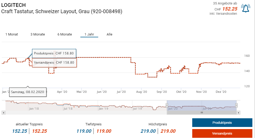 Mit CHF 99.- ist die Tastatur auf digitec.ch aktuell am günstigsten.