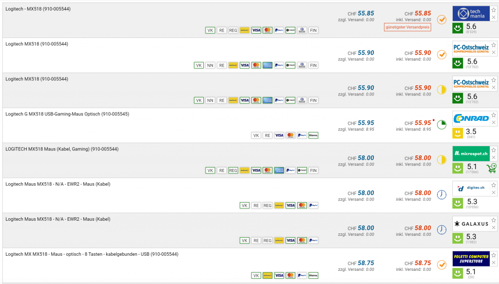 Bei Amazon gibt’s gerade die Gaming-Maus Logitech G MX518 für umgerechnet ca. CHF 39.35 inklusive Lieferung und Versand in die Schweiz. Es lohnt sich, den Mindestbestellwert von 49 Euro zu erreichen, dann ist der Versand zudem gratis und man spart EUR 5.49 zusätzlich.
