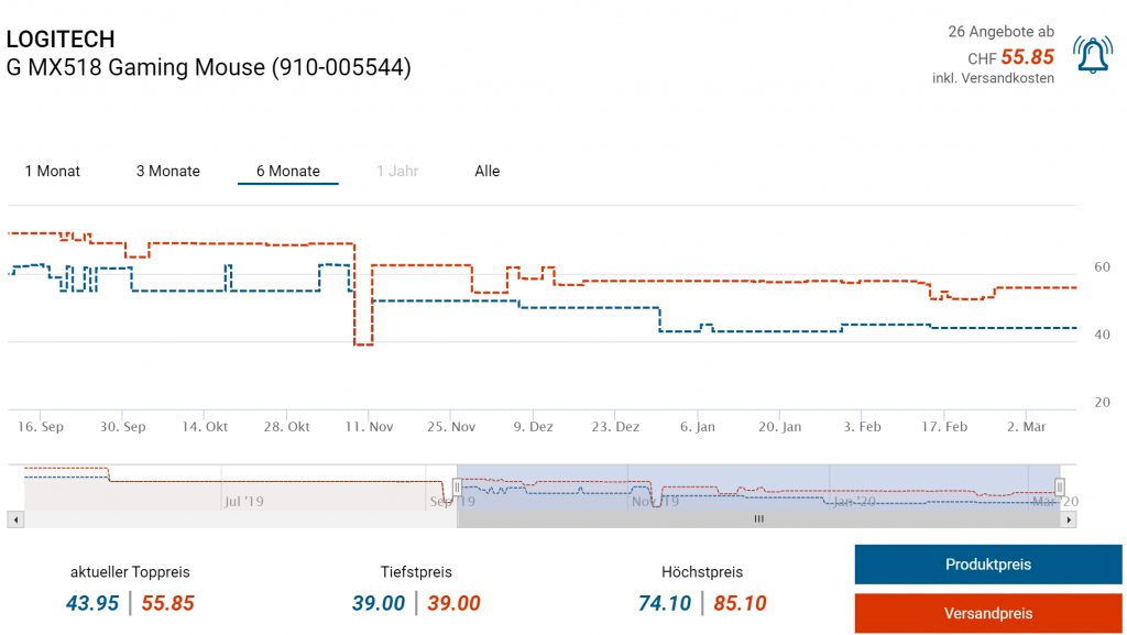 In der Schweiz lag der Bestpreis bei 39 Franken, derzeit zweitbester Preis bei CHF 55.85