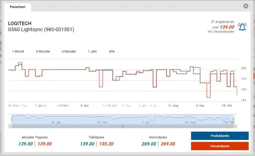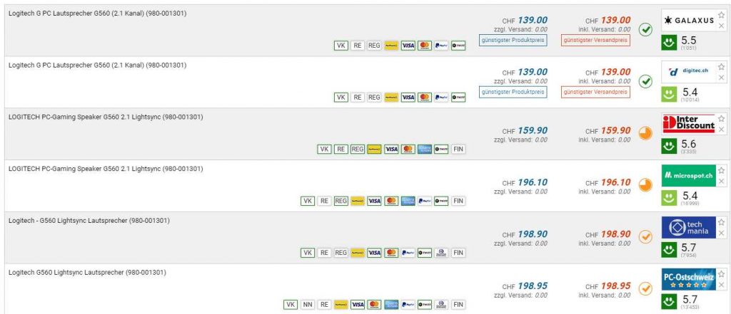 Bei galaxus und dem Schwestern-Shop digitec gibt es die LOGITECH G560 Lightsync Lautsprecher für den Bestpreis von CHF 139.-. Im September lag der Preis bereits bei CHF 135.50, aber ich finde das Angebot trotzdem gut. Der zweitbeste Preis beträgt CHF 159.90.