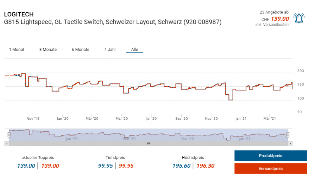 Bei Mediamarkt gibts derzeit die Gaming-Tastatur Logitech G815 Lightsync RGB zum Aktionspreis von 139 Franken. Laut toppreise sollen die Vergleichspreise derzeit bei CHF 163.90 starten, es gab die Tastatur allerdings bereits günstiger. Scheinbar soll das Angebot nur heute gelten.
