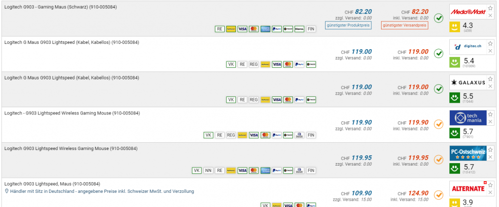 Bei MediaMarkt gibt es die LOGITECH G903 - Gaming Maus für den neuen Bestpreis von CHF 82.20. Der vorherige Bestpreis war bei CHF 87.20. Der zweitbeste Preis beträgt CHF 119.-.