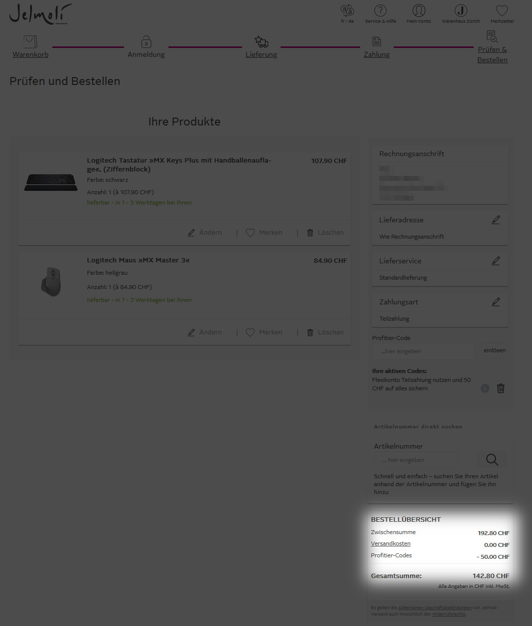 Du musst die Teilzahlung auswählen, damit du den Gutschein benutzen kannst. Laut Jelmoli sollte man dann auch alles aufs Mal bezahlen und die folgenden Gebühren loswerden können