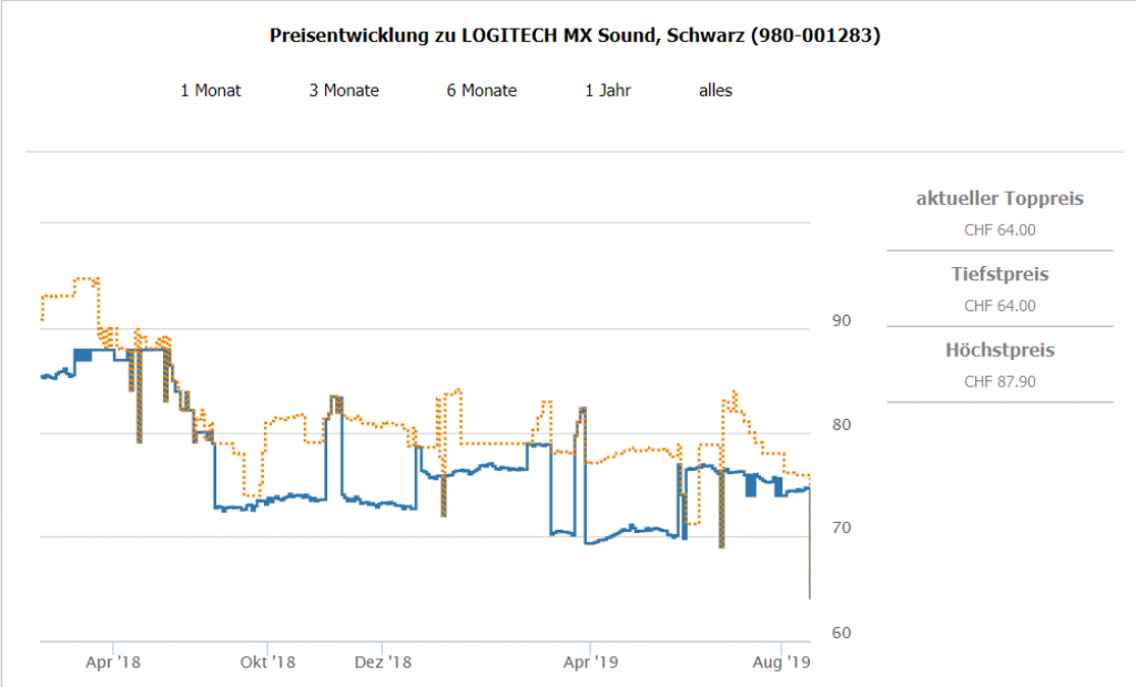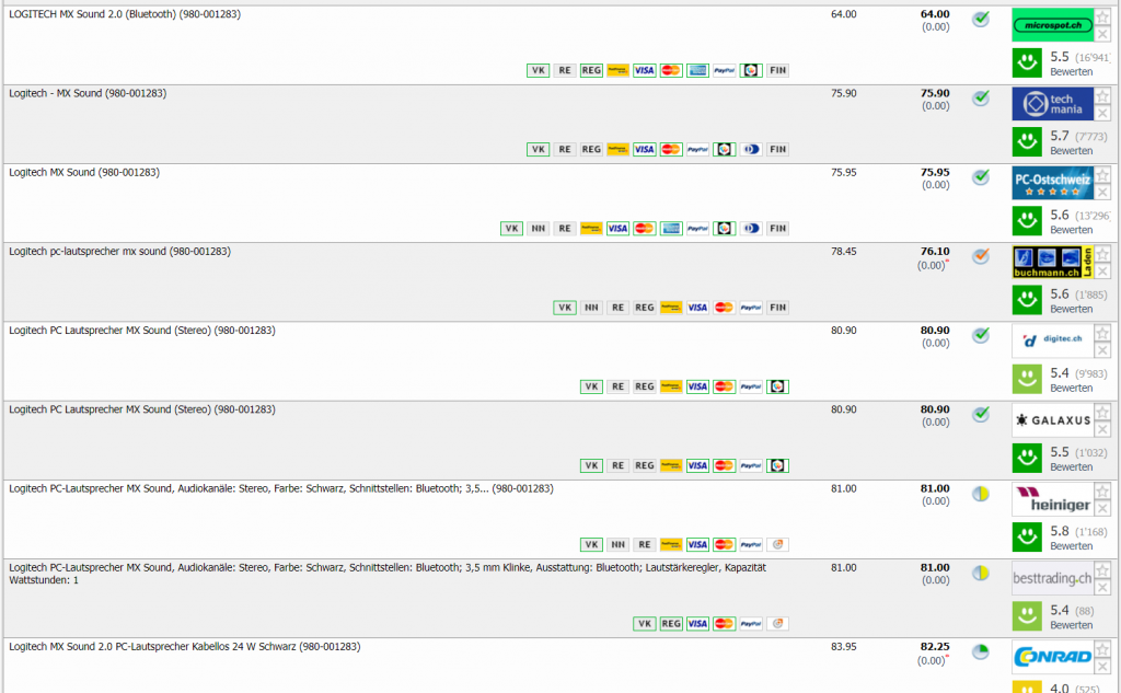 Bei Officeworld erhält man den Logitech Lautsprecher MX Sound für CHF 29.75. Zuzüglich CHF 8.90 für die Lieferung macht total CHF 38.65 Zweitbester Preis in der Schweiz beträgt CHF 64.- das ist gleichzeitig auch der Bestpreis.