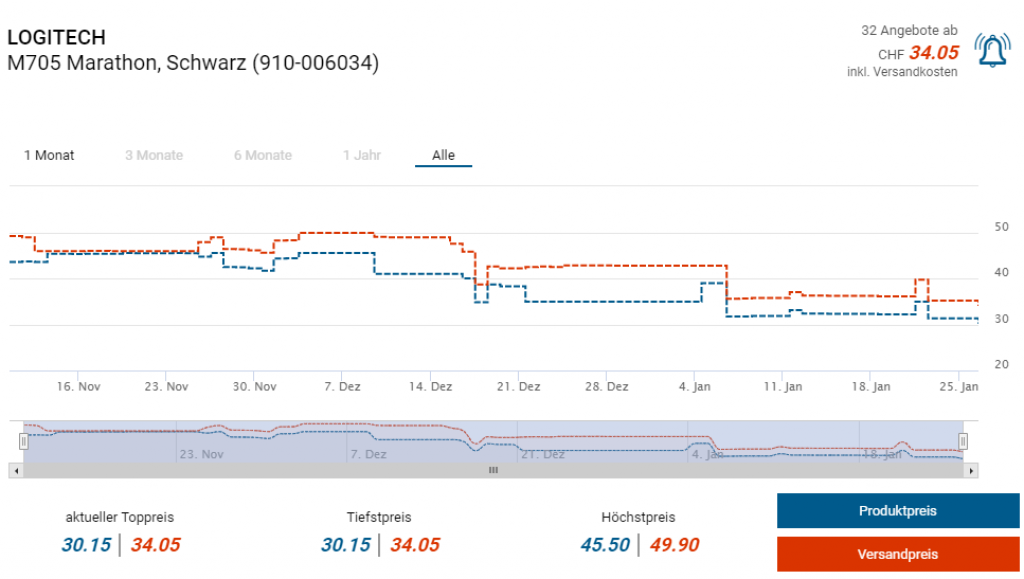 Beim Onlineshop Foletti Computer Superstore gibts derzeit die kabellose Office-Maus Logitech M705 Marathon zum Preis von CHF 30.15 (inkl. Versand dann CHF 34.05). Laut toppreise soll der Vergleichspreis in der Schweiz bei knapp 40 Franken liegen. Amazon hat ein ähnliches Angebot, allerdings müsstet ihr dort den Warenkorbwert von 39€ erreichen um euch die Versandkosten zu ersparen.