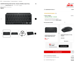 Aktuell gibt es bei MediaMarkt die LOGITECH MX Keys Mini für Mac bei MediaMarkt zum Toppreis von 59.– Franken. Hierfür wird bei anderen Anbietern der Preis von 84.95 Franken verlangt. Das Angebot gilt bis am 24.5., nur solange wie Vorrat.