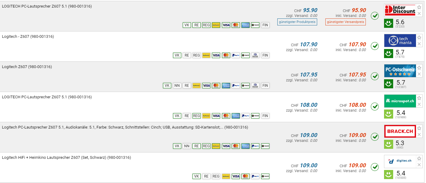 Bei Interdiscount gibt es wieder die LOGITECH PC Z607 5.1 Lautsprecher für den Bestpreis von CHF 95.50. Diesen Bestpreis gab es zuletzt im Juli und davor im Mai. Der zweitbeste Preis beträgt CHF 107.90.