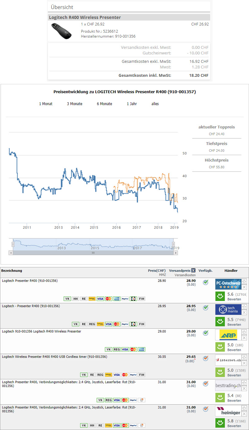 Bei ARP gibt es aktuell den Logitech R400 Wireless Presenter zum Bestpreis von CHF 18.20 wenn sich vorgängig als Neukunde für den Newsletter (Startseite unten rechts) registriert, den Link in der Bestätigungsemail anklick und den anschliessend per E-Mail zugestellten CHF 10.- Rabattcode beim Checkout der Bestellung verwendet.