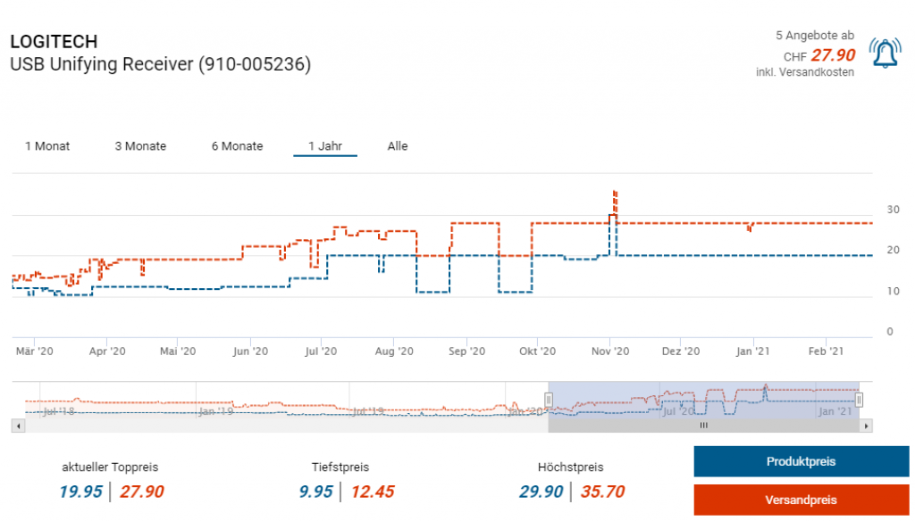 In der Schweiz starten die Preise derweil inkl. Lieferung bei CHF 27.90 (edit: laut Google Shopping ca. 23 Franken), laut toppreise soll der Preis allerdings auch schon bei CHF 12.45 gelegen haben.