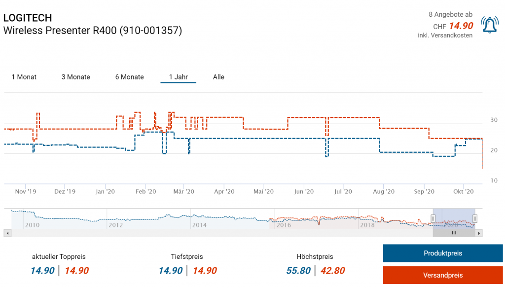 Bei Jelmoli gibt’s den Logitech Wireless Presenter R400 gerade für CHF 14.90 Zweitbester Preis: CHF 31.80 Scheint auch der neue Bestpreis zu sein, vormalig hat man noch CHF 18.20 bezahlt.