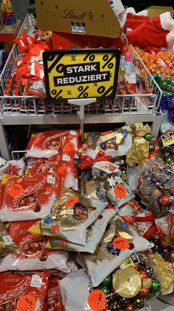 Also es ist das Weihnachtssortiment bei Migros Denner sicher,darunter hat es aber auch Raffaello,Mon Cherie,Ferrero,Merci,etc.50% ist bis Freitag ab 3.1.wird es 75%.Also bei uns hat es noch genügend Wäre und die orthodoxen freuen sich immer da sie erst am 6.1 Weihnachten feiern