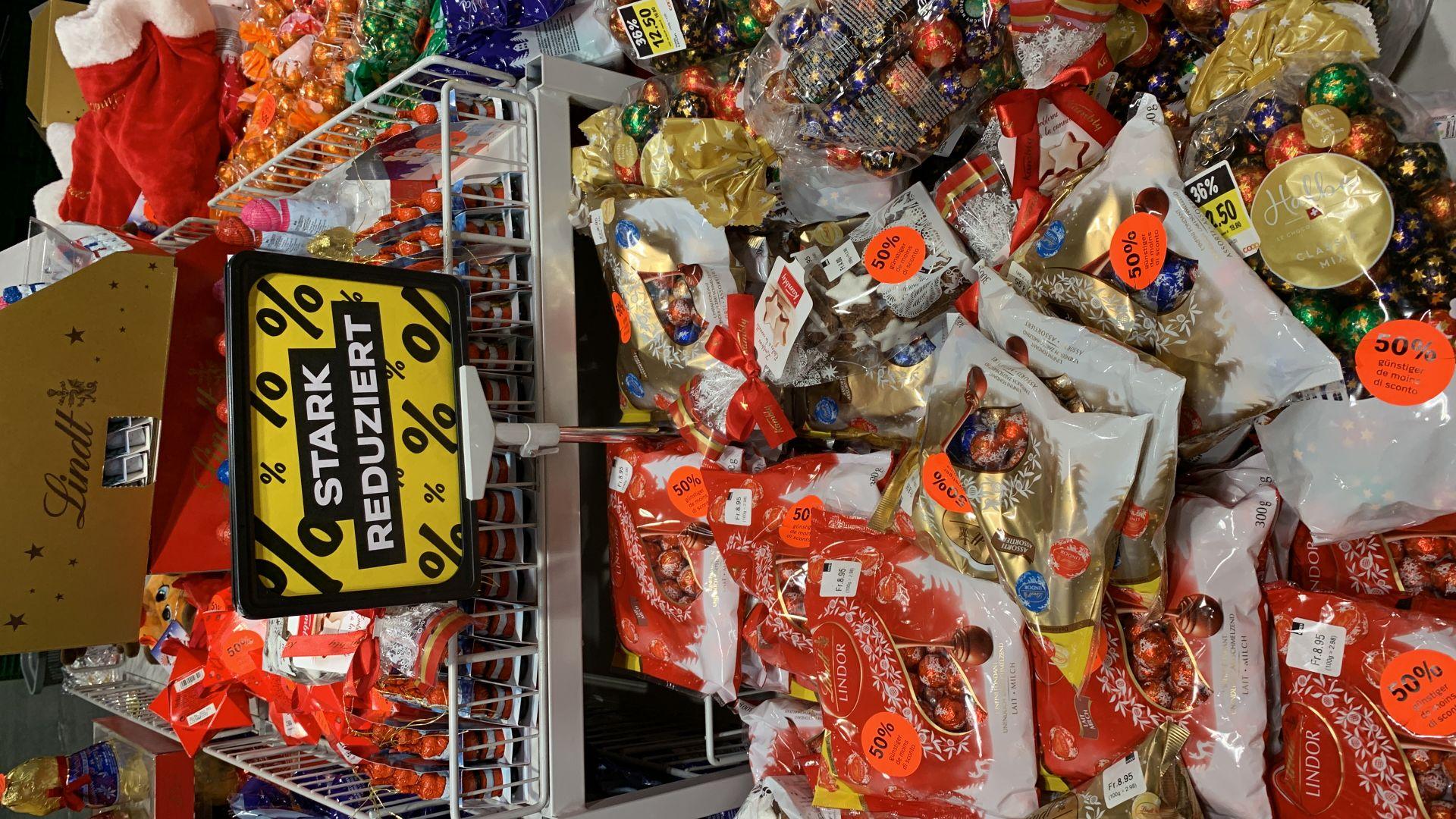 Also es ist das Weihnachtssortiment bei Migros Denner sicher,darunter hat es aber auch Raffaello,Mon Cherie,Ferrero,Merci,etc.50% ist bis Freitag ab 3.1.wird es 75%.Also bei uns hat es noch genügend Wäre und die orthodoxen freuen sich immer da sie erst am 6.1 Weihnachten feiern