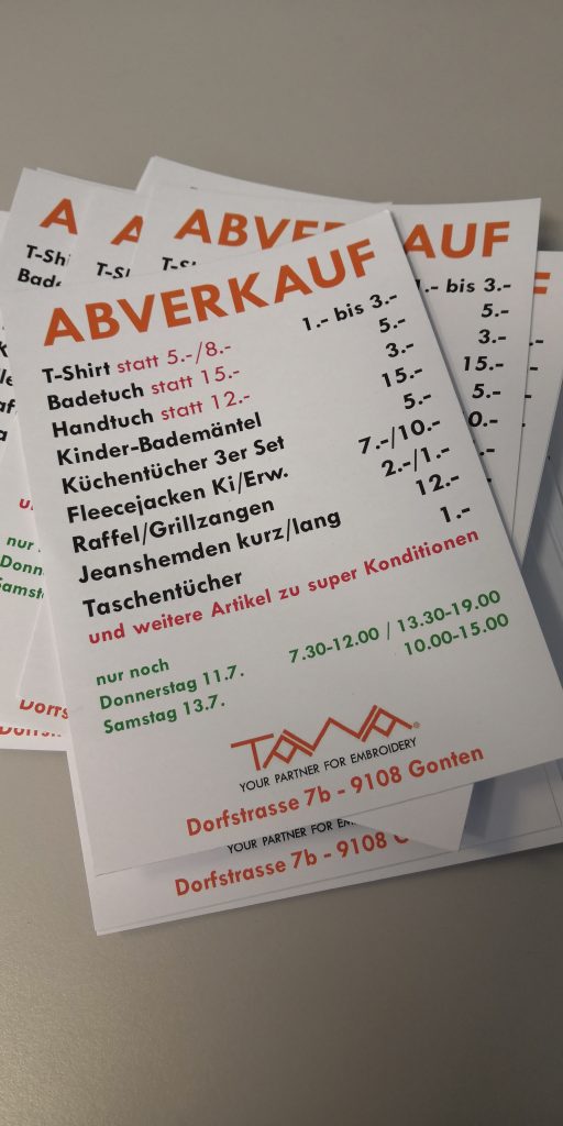 Am Samstag gibt es bei der TAWA Albert Weishaupt AG in Gonten einen Abverkauf. Es hat Outdoorjacken mit 60% Rabatt, Frottierwäsche mit bis zu 75% Rabatt und viele weitere Artikel wie Küchentücher, T-Shirts.