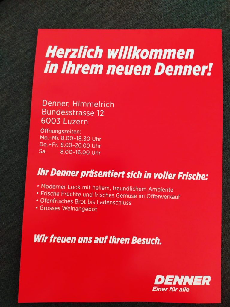 Am Donnerstag öffnet eine neue Denner Filiale im Himmelrich (Bundesstrasse 12, 6003 Luzern). Zur Feier gibt es bis Samstag 10% Rabatt auf fast alles! Angebot nur in der neuen Filiale gültig. Bundesstrasse 12 6003 Luzern