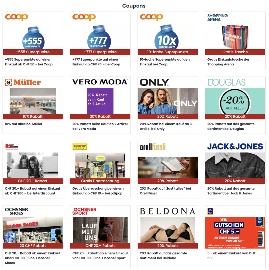 - Coop 10-fach Superpunkte, weitere Coop Gutscheine (+555 Punkte ab 50 CHF, + 777 Punkte ab 70 CHF). Das sind wohl keine Bons die man auch so in der Coop Supercard App hat, zumindest habe ich sie nicht.