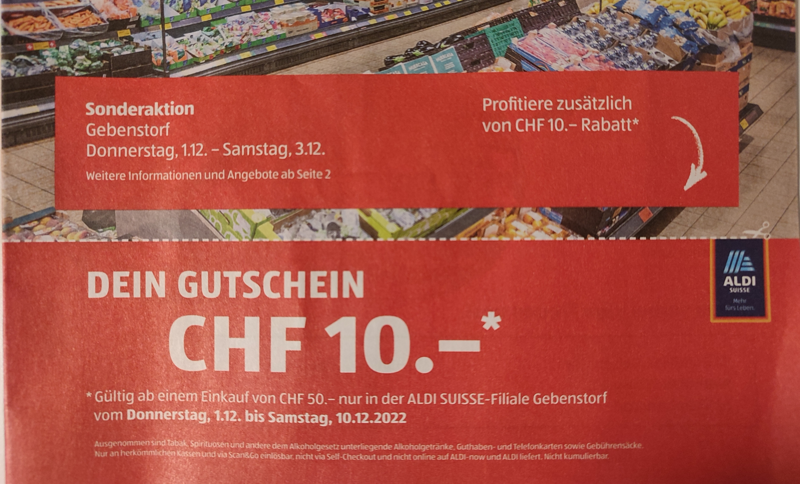 Die wiedereröffnete Aldifiliale in Gebenstorf AG bietet bis zum 10. Dezember 10 Fr. Sofortrabatt (an der Kasse abgezogen) ab einem Gesamteinkaufswert von 50 Fr.