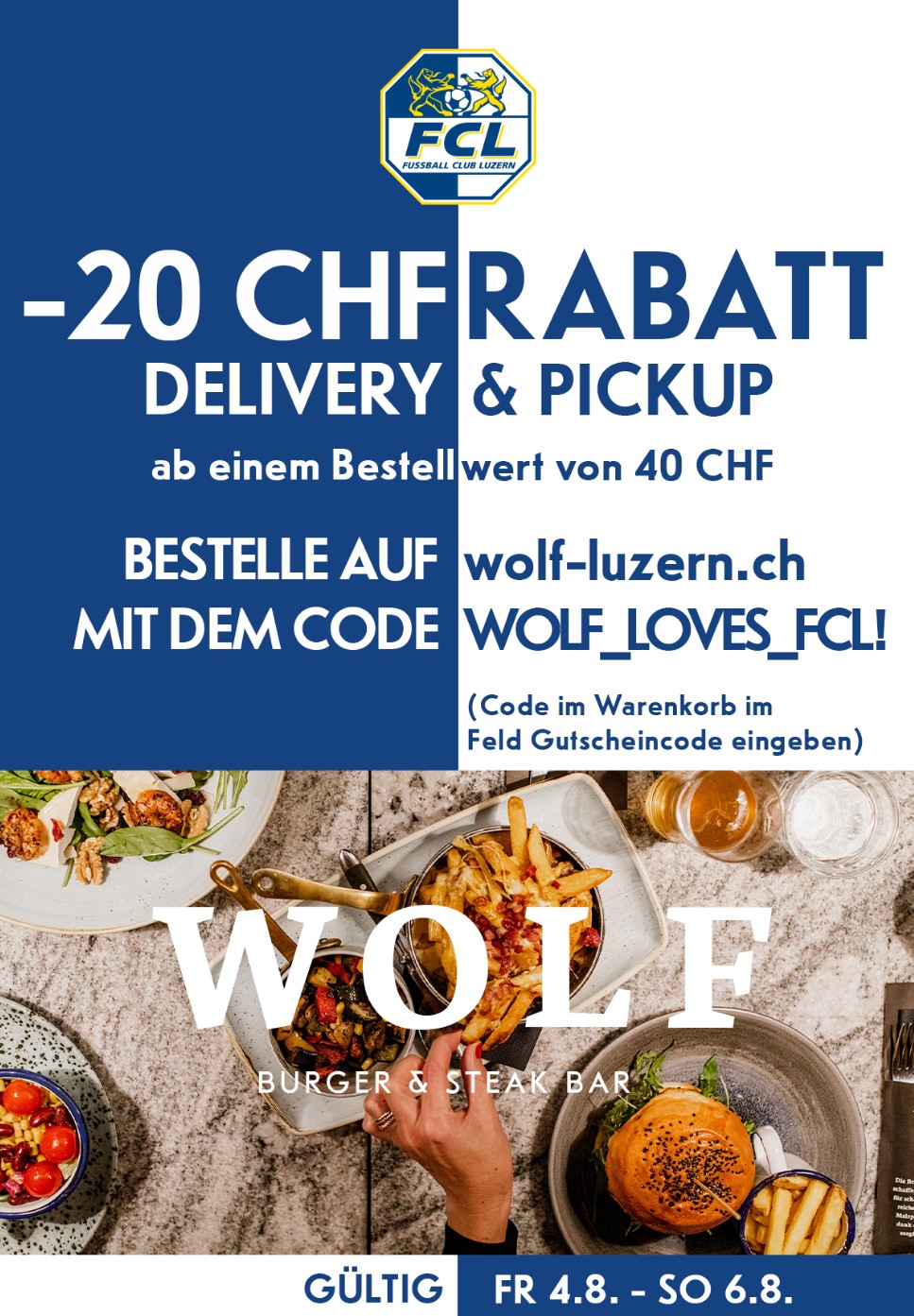Passend zum erfolgreichen Weiterkommen des FC Luzern in die 3. Qualifikationsrunde der Conference League, bietet das Burger & Steak Restaurant WOLF für Pick Up & Delivery Bestellungen einen 20 CHF Rabatt an bei einem MBW von 40 CHF.