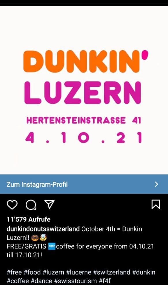 Am 4. Oktober 2021 wird in Luzern ein Dunkin‘ Donuts Shop eröffnet. Laut einer Promotion auf Instagram gibt es deshalb für alle Kund:innen vom 4. Oktober - 17. Oktober gratis Kaffee.
