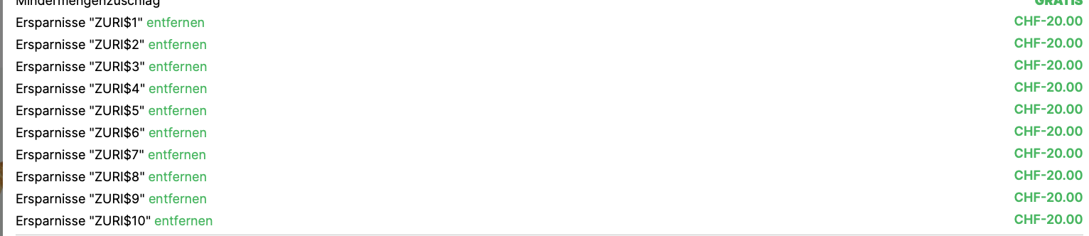 Bei Alfies.ch könnt ihr aktuell mehrere “ZURI$X”-Gutscheine gleichzeitig einlösen! 🎉 Jeder Gutschein bringt 20 CHF Rabatt, und es lassen sich beliebig pro Bestellung kombinieren. Ich habe bis jetzt lediglich bis ZURI$10 ausprobiert, es kann aber sein dass es mehr gibt. – Selbst der Mindermengenzuschlag fällt weg.