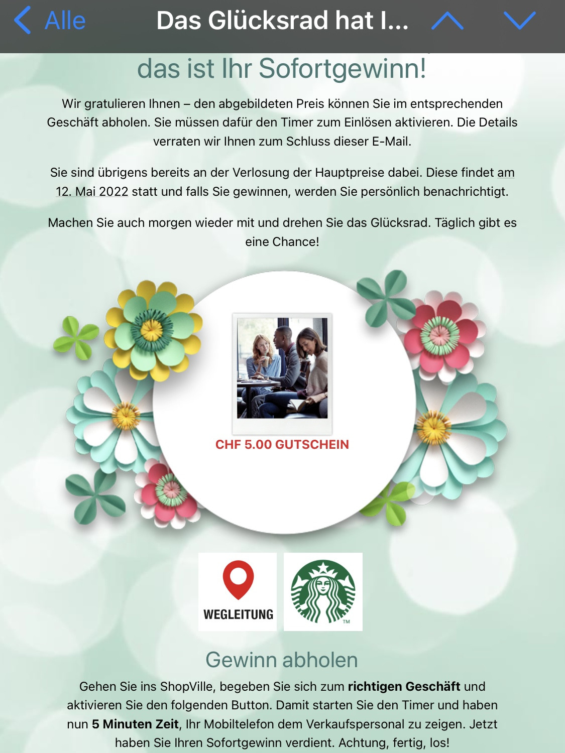 Der Starbucksgutschein ist eine Mogelpackung. Man bekommt nicht 5chf gutgeschrieben sondern der gewählte Artikel kostet max. 5chf.