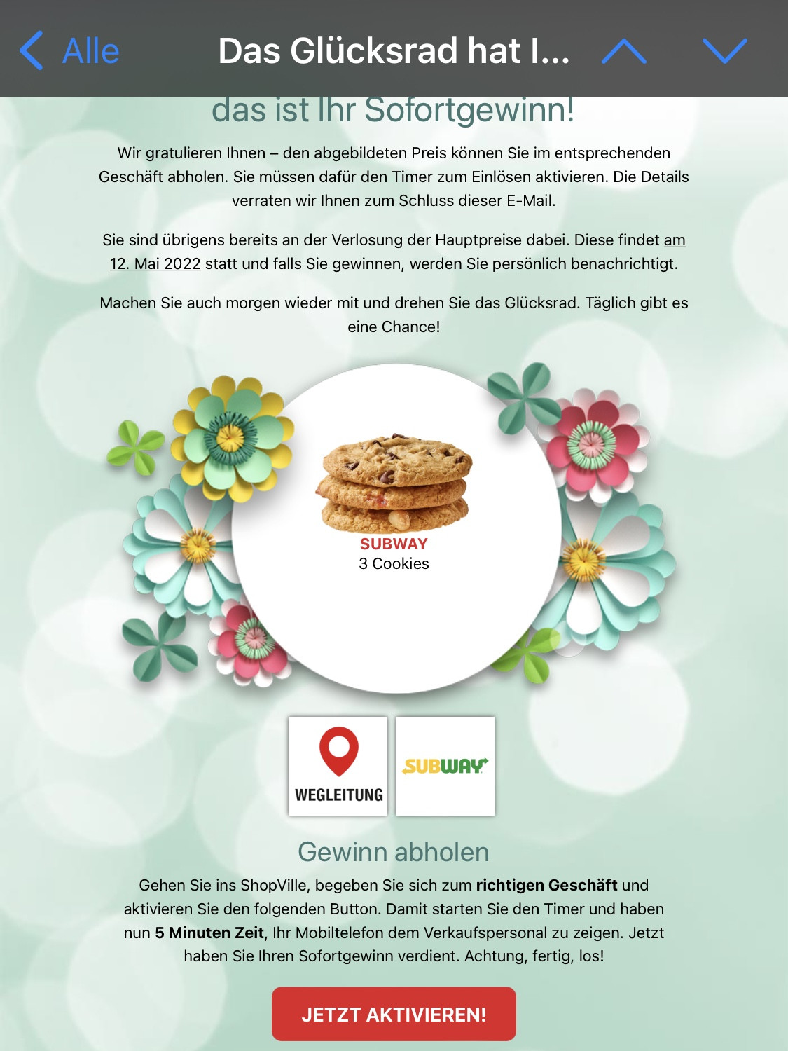 Beim Glücksrad hat man Chancen auf Gratis Sofortgewinne und Rabattcoupons bei ausgewählten Geschäften im ShopVille. Darüberhinaus gibt es auch eine Hauptverlosung. Zum Teilnehmen muss der Name, die E-Mail und die Telefonnummer angegeben werden.