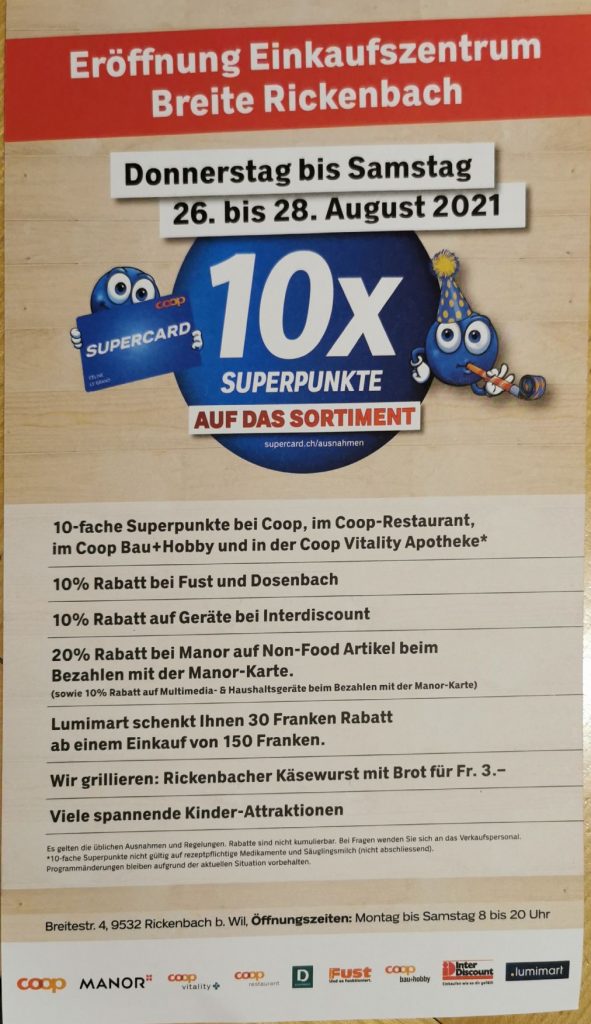 In der kleinen Gemeinde von Rickenbach TG wird morgen, am Donnerstag dem 26.08., das Einkaufszentrum Breite Rickenbach eröffnet. Dabei gibt’s zur Feier einige interessante Angebote: