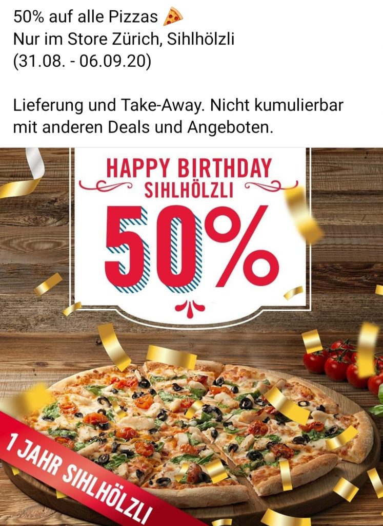 Zur Feier von 1 Jahr Domino’s Pizza am Standort Sihlhölzli ZH gibts derzeit alle Pizzen im Takeaway und bei Lieferung zum halben Preis. Ich habe zunächst flüchtig eine Werbung auf Facebook dazu gesehen, habe aber vergessen einen Screenshot davon zu machen. Ich denke aber, dass die Aktion bis Ende September gilt. Die Aktion gilt eine Woche lang, bis zum 6.9.