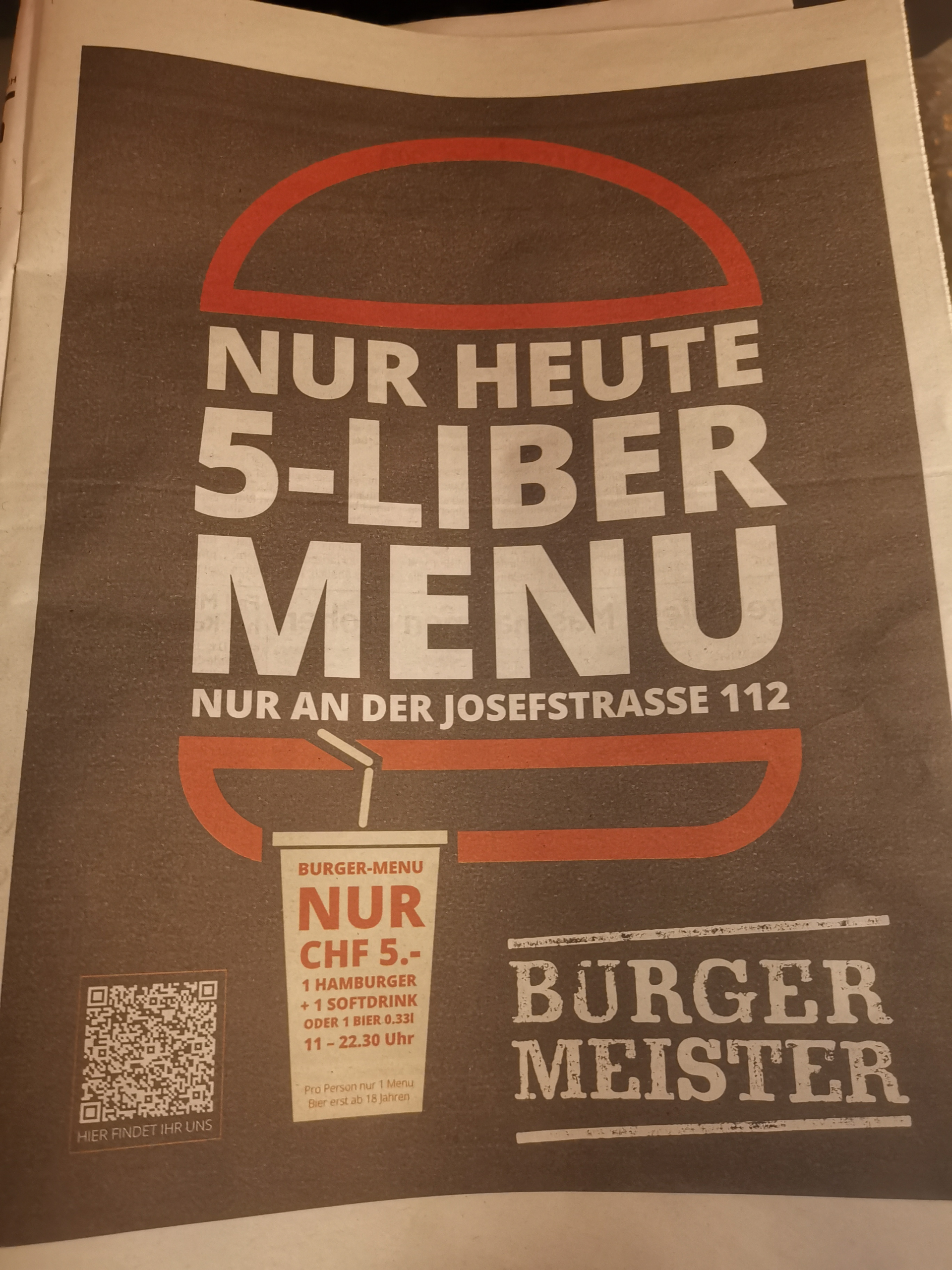 Heute kriegt ihr bei Burger Meister an der Josefstrasse in Zürich einen Burger und ein Softdrink für unschlagbare 5 CHF!