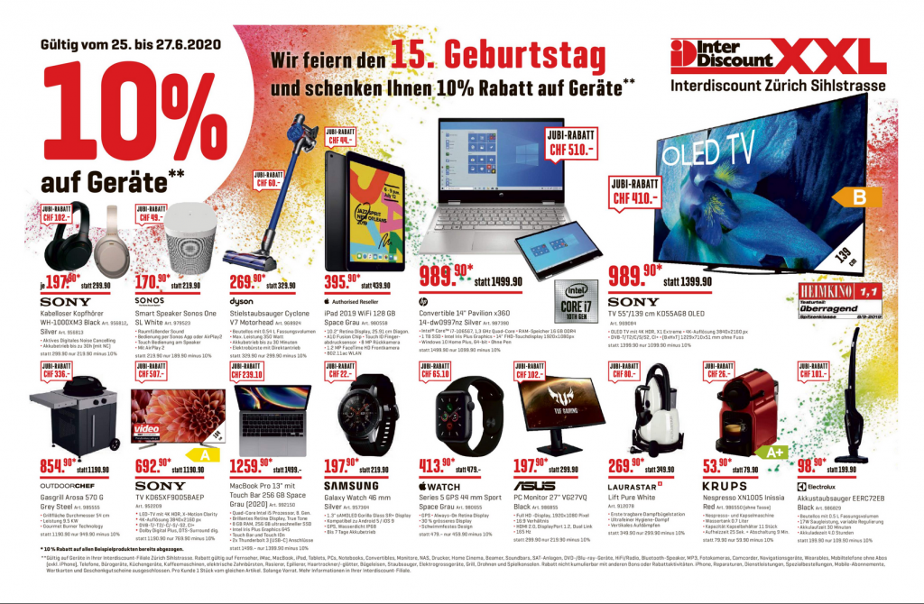 *Gültig auf Geräte in Ihrer Interdiscount-Filiale Zürich Sihlstrasse. Rabatt gültig auf Fernseher, iMac, MacBook, iPad, Tablets, PCs, Notebooks, Convertibles, Monitore, NAS, Drucker, Home Cinema, Beamer, Soundbars, SAT-Anlagen, DVD-/Blu-ray-Geräte, HiFi/Radio, Bluetooth-Speaker, MP3, Fotokameras, Camcorder, Navigationsgeräte, Wearables, Mobiltelefone ohne Abos