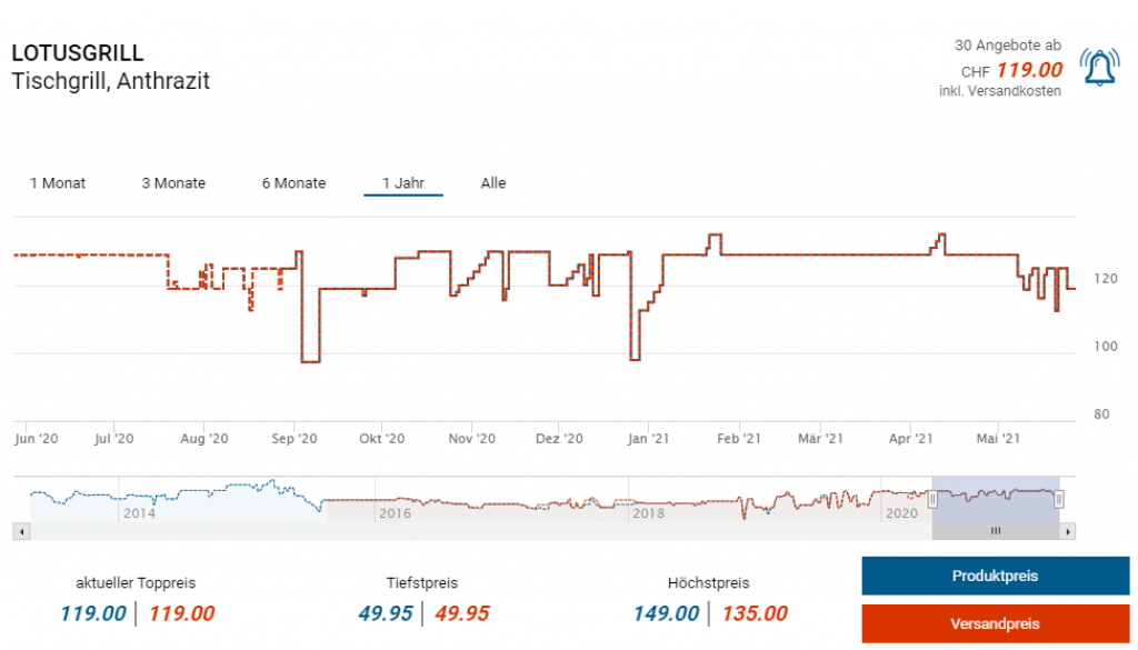 Bei Manor gibts heute ein weiteres gutes Angebot. So gibts den kleinen innovativen Holzkohlegrill Lotusgrill Original zum Aktionspreis von CHF 119.20, wenn man im Besitz der kostenlosen und schnell erstellten Manor Card ist. Wenn ihr euch allerdings zum Newsletter anmeldet, könnt ihr den Preis durch den erhaltenen Gutschein um weitere 20 Franken drücken. Laut toppreise solls ihn mal für knapp 50 Franken gegeben haben, was allerdings ein Preisfehler gewesen sein dürfte. Zurzeit kostet er beim zweitgünstigsten Anbieter 119 Franken und auch sonst taucht er selten unter die Marke von 100 Franken.