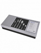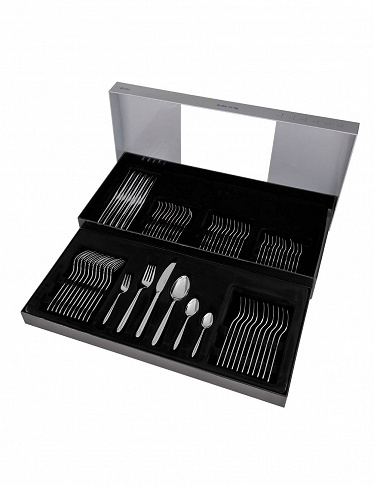 Klassisch und edel. Im Set: 12 Esslöffel, 12 Gabeln, 12 Messer, 12 Kaffeelöffel, 12 Moccalöffel und 12 Kuchengabeln. Aus hochwertigem Edelstahl 18/10 und 10/0. Teilsatiniert.