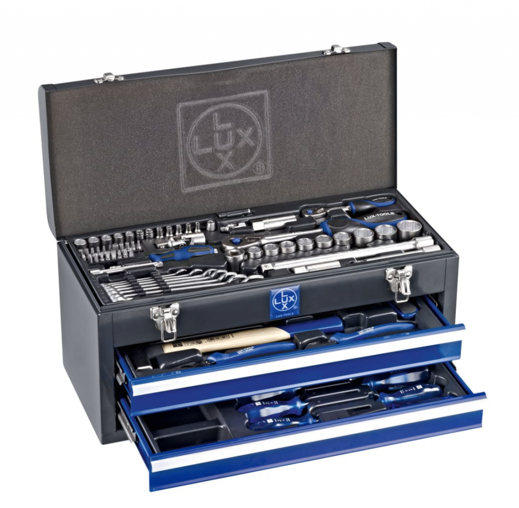 Werkzeugkoffer gehören nicht nur beim professionellen Einsatz zur Grundausstattung, sondern helfen auch Heimwerkern weiter, zahlreiche Arbeiten selber durchzuführen. Mit diesem 71-teiligen Werkzeugkoffer entscheiden Sie sich für die hohe Materialqualität eines strapazierfähigen Koffers für den mobilen Einsatz. Zum Inhalt des 3.5 kg schweren Koffers gehören aus hochwertigem Stahl gefertigte Werkzeuge. Durch den Koffer sind sie sicher vor Staub und Stössen geschützt und können reibungslos transportiert oder fachgerecht gelagert werden. Der LUX-TOOLS Werkzeugkoffer besteht aus 71 Teilen. - 7 x Gabel-Ringschlüssel (8 / 10 / 12 / 13 / 14 / 15 / 17 mm) - 1 x 6,3 mm (1/4″) Hebel-Umschaltknarre - 1 x 6,3 mm (1/4″) Verlängerung (100 mm) - 1 x 6,3 mm (1/4″) Kardangelenk - 1 x 6,3 mm (1/4″) Bit Adapter - 1 x 6,3 mm (1/4″) Handgriff - 12 x 6,3 mm (1/4″) Stecknüsse (4 / 4,5 / 5 / 5,5 / 6 / 7 / 8 / 9 / 10 / 11 / 12 / 13 mm) - 1 x 12,5 mm (1/2″) Hebel-Umschaltknarre - 2 x 12,5 mm (1/2″) Verlängerung (125 und 250 mm) - 1 x 12,5 mm (1/2″) Kardangelenk - 2 x 12,5 mm (1/2″) Zündkerzeneinsatz (16 und 21 mm) - 1 x 12,5 mm (1/2″) Schiebegriff - 9 x 12,5 mm (1/2″) Stecknüsse ( 14 / 15 / 16 / 17 / 18 / 19 / 22 / 24 / 27 mm) - 3 x Kreuzschlitz-Bits PH (1 / 2 / 3) - 3 x Kreuzschlitz-Bits PZ (1 / 2 / 3) - 3 x Schlitz-Bits SL (4 / 5,5 / 6,5 mm) - 5 x Sechskant-Bits (3 / 4 / 5 / 6 / 8 mm) - 6 x Torx-Bits TX (10 / 15 / 20 / 25 /30 / 40) - 1 x Schlosserhammer 300 g - 1 x Seitenschneider 160 mm - 1 x Kombizange 180 mm - 1 x Metallsägebogen 150 mm - 1 x Spannungsprüfer - 2 x Schlitz-Schraubendreher SL (5,5 / 8 mm) - 2 x Kreuzschlitz-Schraubendreher PH (1 / 2) - 2 x Kreuzschlitz-Schraubendreher PZ (1 / 2)