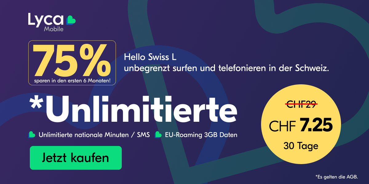 Bei Lyca Mobile gibt’s aktuell wieder ein tolles Mobilabo-Angebot! So profitiert ihr von vielen Inklusivleistungen zum top Preis von CHF 7.25 pro Monat. Der Aktionspreis gilt für 6 Monate.