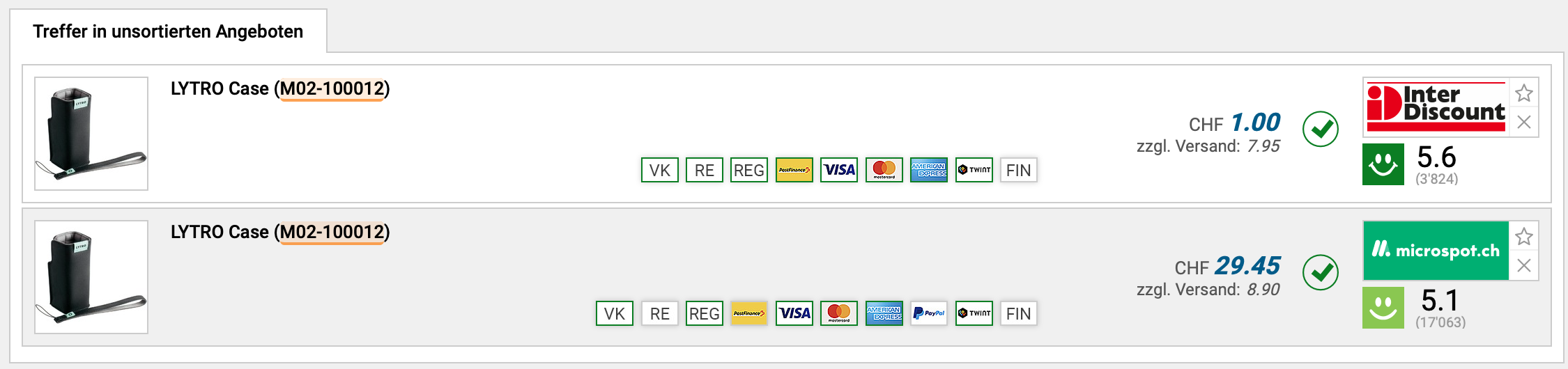 Beim Interdiscount gibt’s gerade das LYTRO Case für CHF 1.- Zweitbester Preis beträgt CHF 29.45.- Kompatibel mit Modell Lytro Lichtfeldkamera