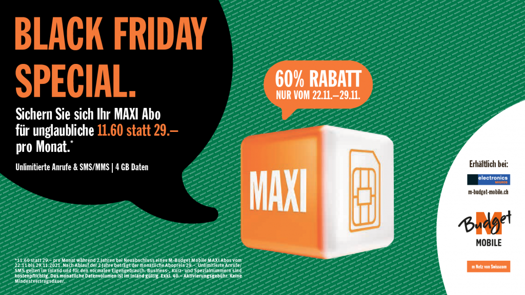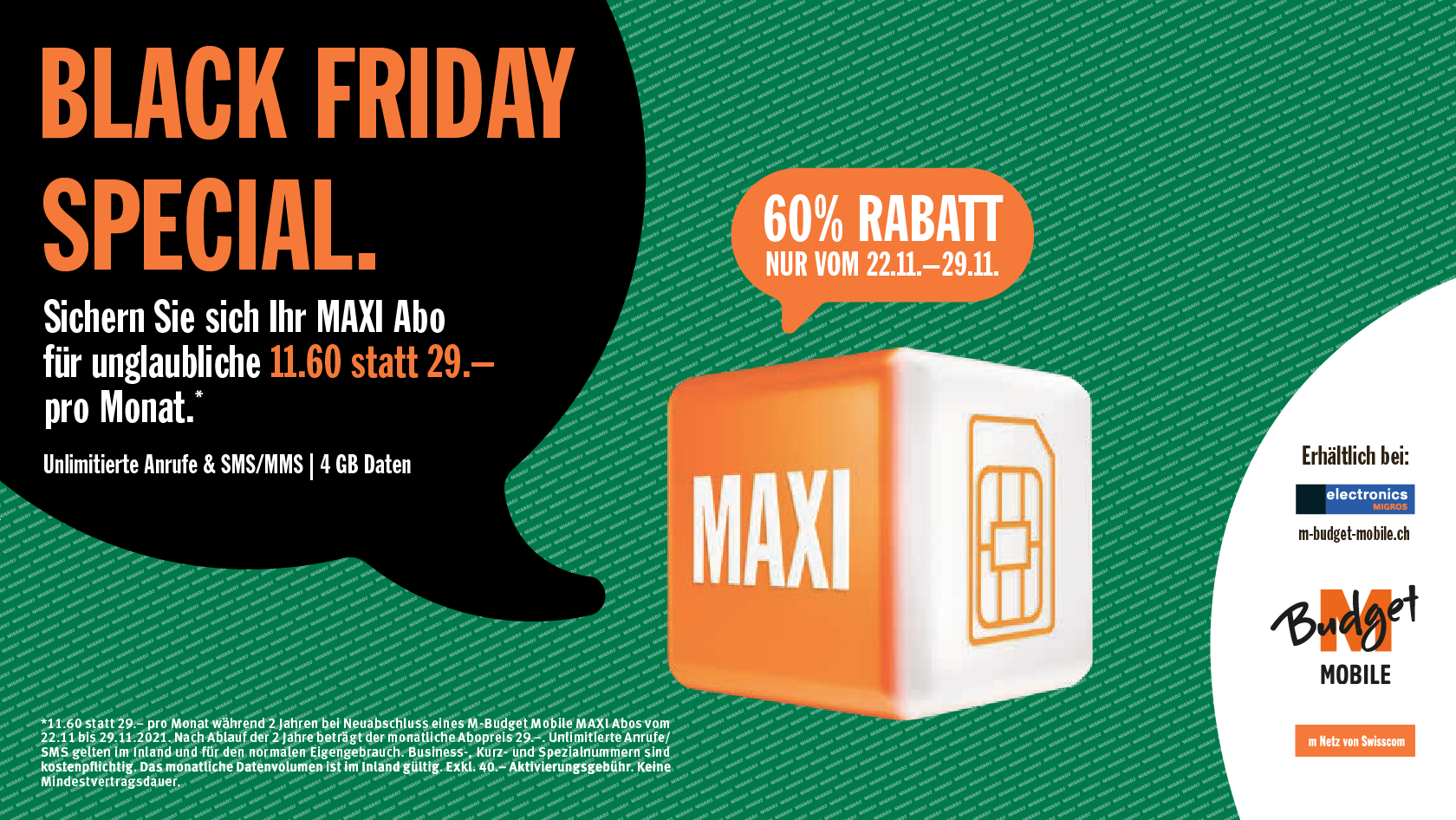 BLACK FRIDAY SPECIAL mit M-Budget Mobile Sichern Sie sich Ihr MAXI Abo für unglaubliche CHF 11.60 statt CHF 29.– pro Monat während 2 Jahre.