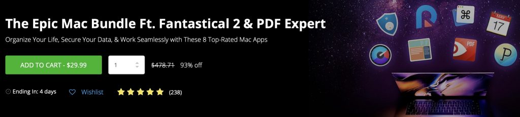 MacHeist bietet derzeit ein Bundle mit PDF Expert, Fantastical 2, Flux 7, Pagico 8, Command-Tab Plus, iStat Menus 6, iLocker Pro und Ultdata Recovery für USD 30 an. Die ersten beiden kann ich vorbehaltlos empfehlen, den Rest kenne ich nicht.