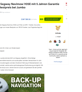 Bei Jumbo und Hornbach gibt es aktuell den Mähroboter Segway Navimow i105E zum Preis von 899.- Franken. Da Jumbo derzeit noch einen Bon in der Supercard-App hat, bekommt ihr ihn sogar zum neuen Bestpreis von 789.10 Franken. Laut Toppreise liegt der Preis bei anderen Anbietern bei 899.- Franken.