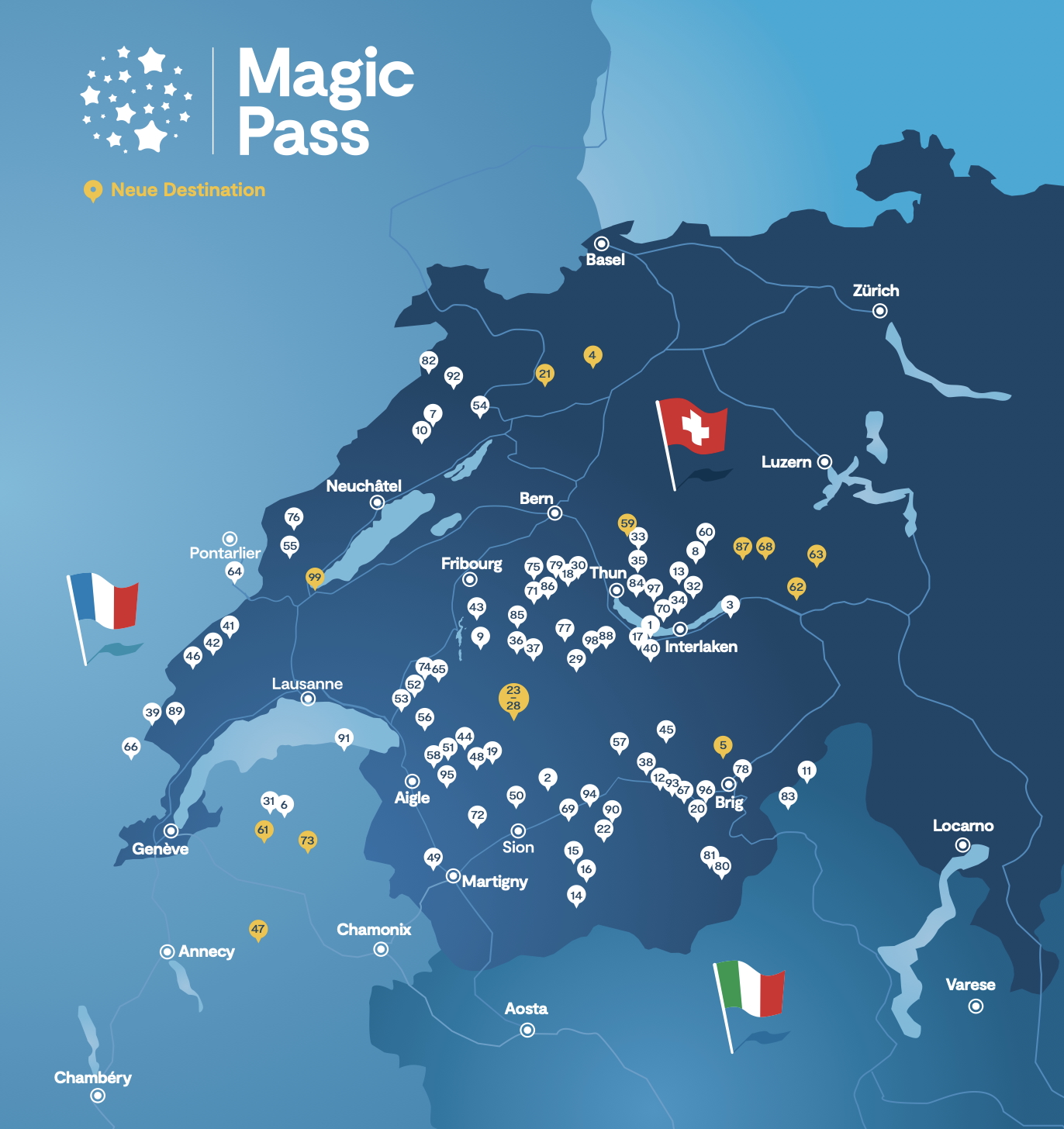 Magic Pass ist ein für alle verfügbares Jahresabonnement, ideal vor allem für Berner, Walliser und Romands. Unbegrenzter Zugang zu 92 Skigebieten, inklusive Saas Fee, Gstaad, Zinal, St-Luc, usw. Dieses bietet einen freien Zugang zu allen Anlagen unserer Partnergebiete, gültig ab Sommereröffnung bis zum Ende der folgenden Wintersaison.