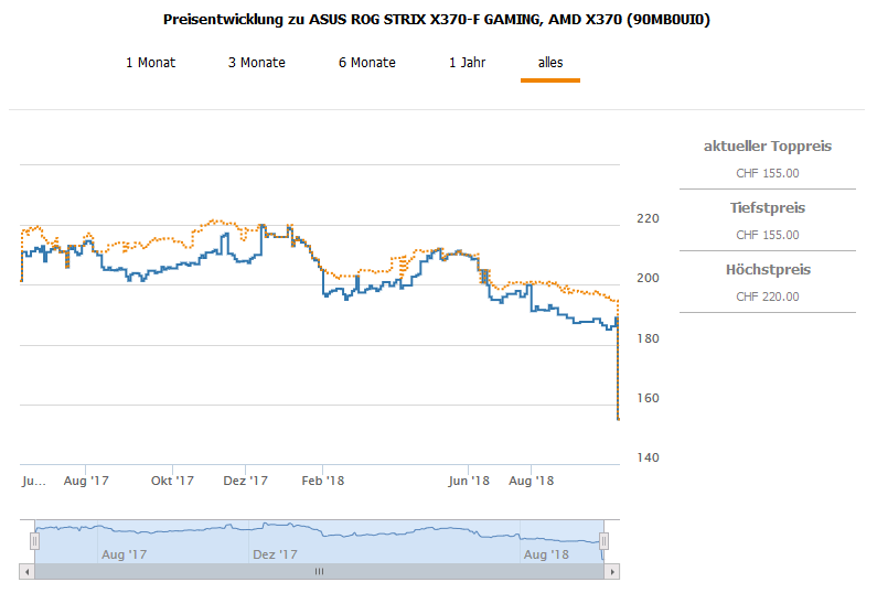 Gemäss toppreise gab es das Mainboard bislang nie günstiger als für 194.90 CHF was zugleich aktuell auch der zweitbeste Preis ist.