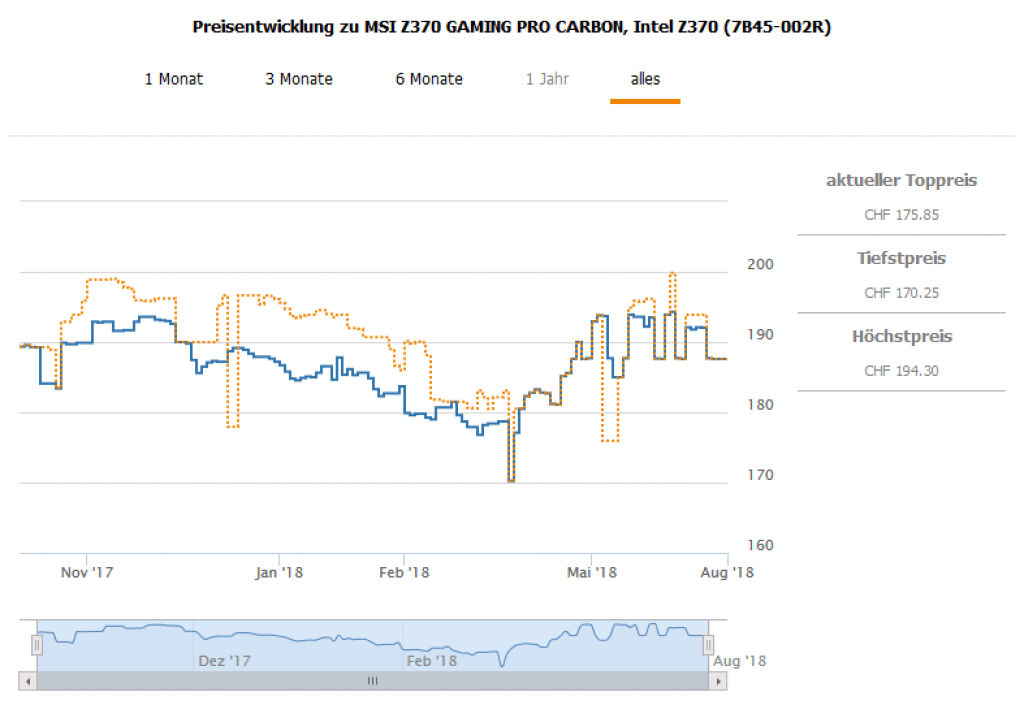 Gemäss toppreise gab es das Mainboard bislang noch nie günstiger als für 170.25 CHF, der zweitbeste Preis liegt aktuell bei 175.85 CHF.