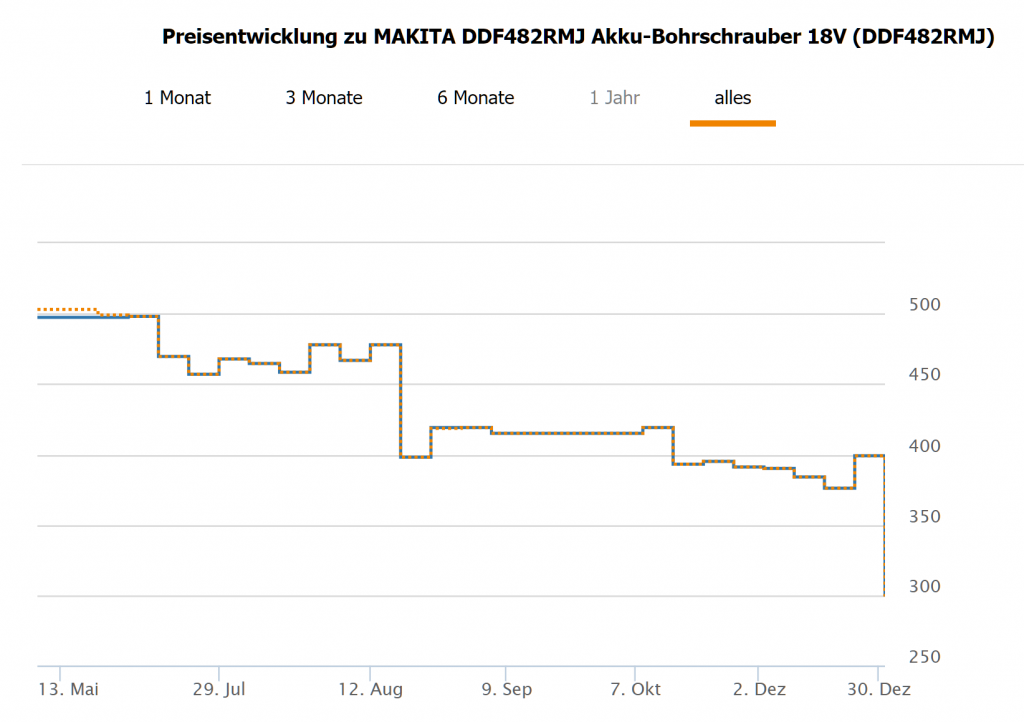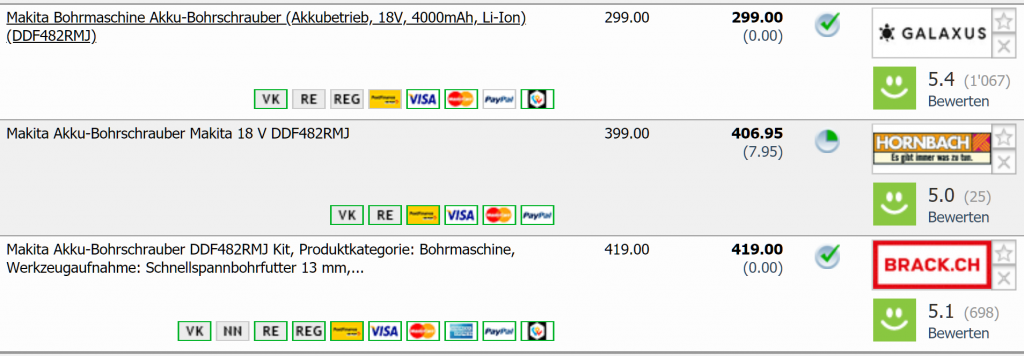 Bei Galaxus gibt’s den Makita Akku-Bohrschrauber (Akkubetrieb, 18V, 4000mAh, Li-Ion) für CHF 299.- Zweitbester Preis ist CHF 399 bei Hornbach. Bestpreis war CHF 376.-