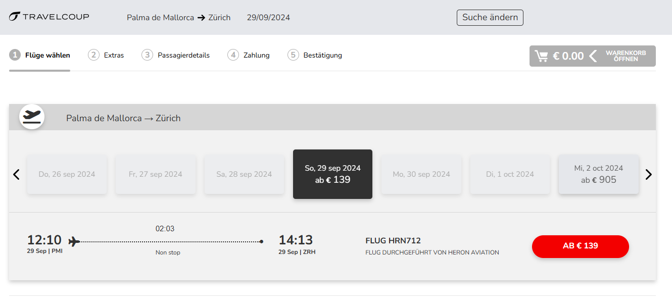 Nun wird nächsten Sonntag der Flug von Mallorca nach Zürich für 139 CHF/EUR angeboten.
