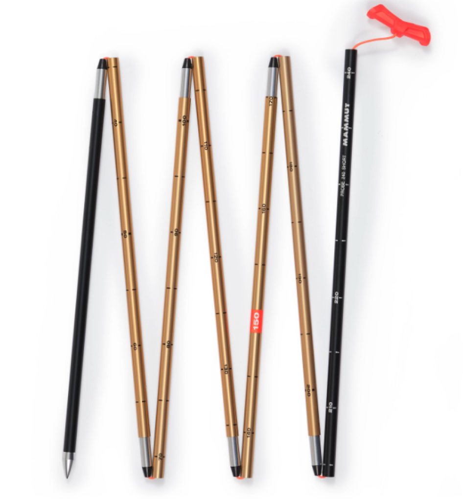 Die Probe 240 Short von Mammut ist eine Lawinensonde, die mit ihrem kleinen Packmass in jedes Tourengepäck passt. Sie besteht aus 7 Segmenten, gefertigt aus stabilem, leichtem Aluminium. Die Sonde lässt sich intuitiv über ein Teleskopsystem mit einer integrierten zugfesten Kordel spannen.