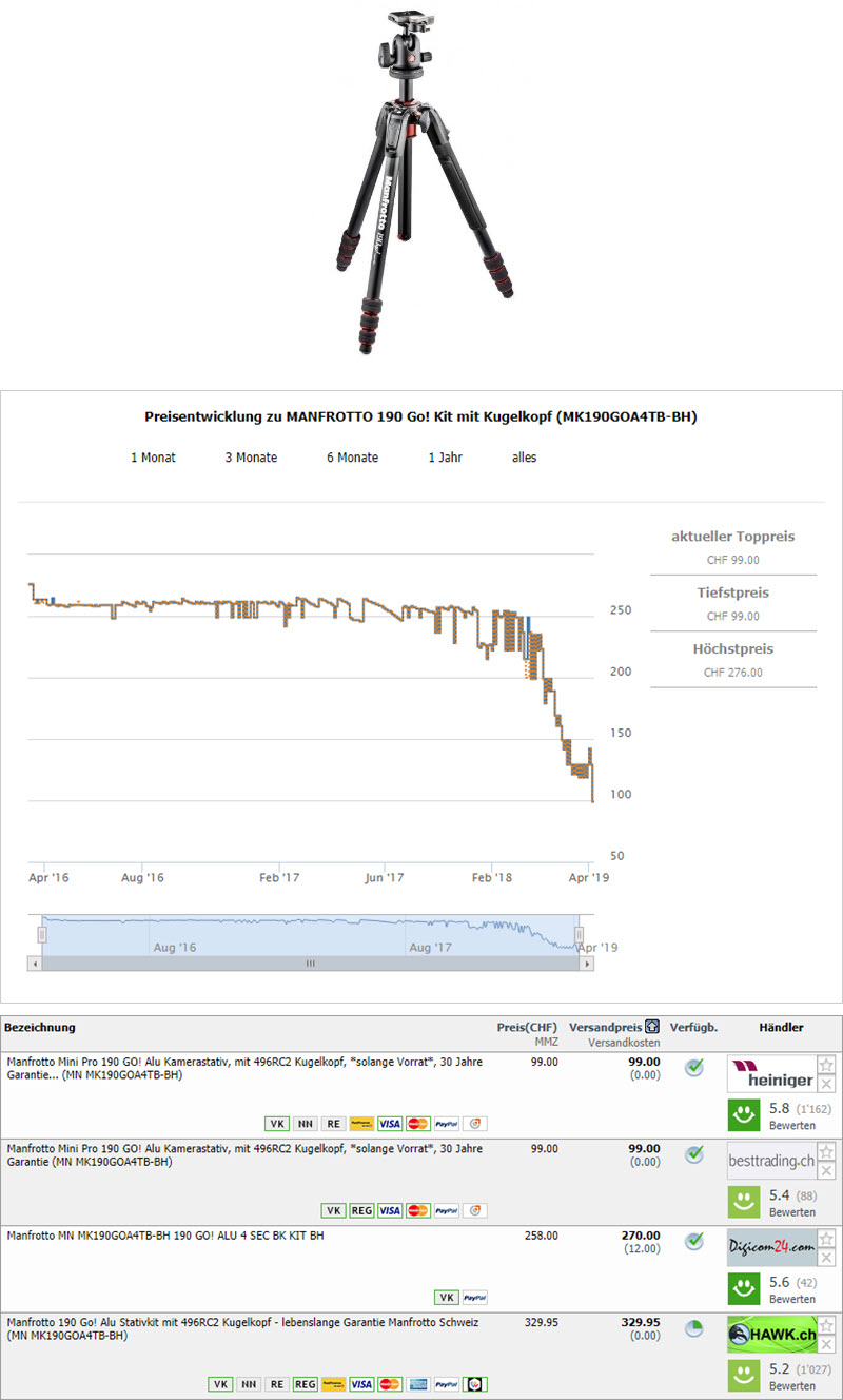 Bei Heiniger AG gibt es solange Vorrat das Manfrotto Mini Pro 190 GO! Alu Kamerastativ mit 496RC2 Kugelkopf zum Bestpreis von CHF 99.-.