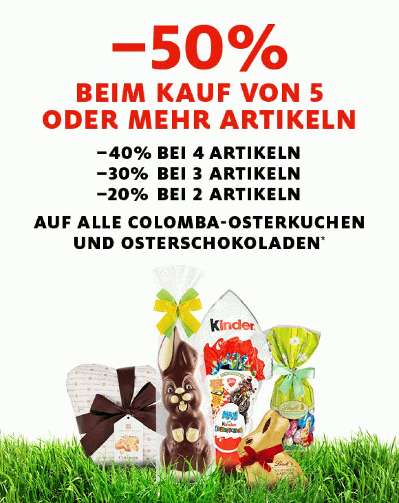 Bei Manor gibt’s gerade eine top Osterschokolade Aktion: Man spart beim Kauf ab 5 Artikeln 50%, bei 4 Artikeln 40%, bei 3 Artikeln 30% und beim Kauf von 2 Artikeln immerhin noch 20%. Es ist kein Gutscheincode notwendig, der Rabatt wird automatisch im Warenkorb abgezogen. Nicht kombinierbar mit dem Gutschein, den man für die Newsletter-Anmeldung erhält.