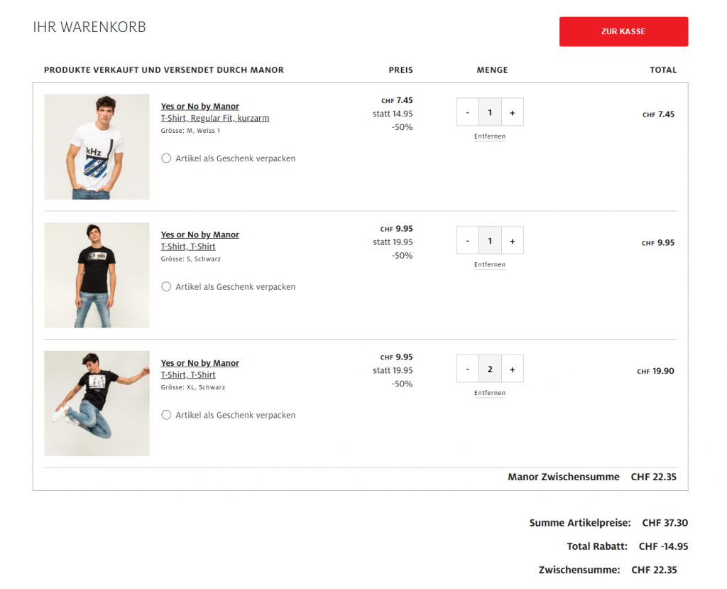 - Warenkorb mit günstigen Artikeln befüllen, bis man 4 Artikel im Warenkorb hat (Bei Damenartikeln z.B. ab CHF 4.45)