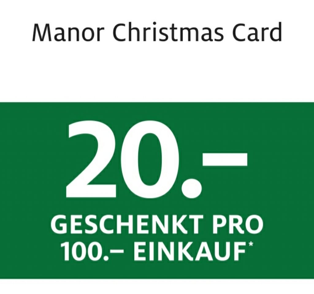 Manor bietet gerade eine Weihnachtsaktion an: 20.- geschenkt, pro 100.- Einkauf**. Die Aktion läuft bis zum 24.11.2020.